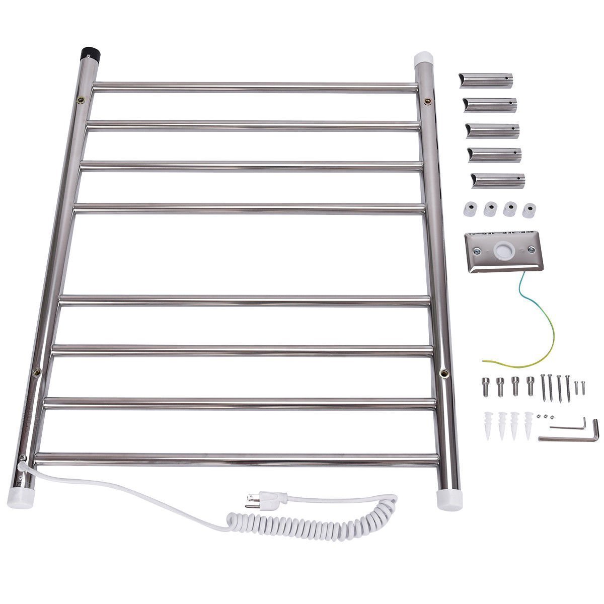 Details: This is wall mounted towel warmer which has eight bars for hanging multiple towels at once, making it perfect for warming up the entire family. Equipped with 115W power, this warmer is highly efficient to warm your delicates, towels, bathing suits, blankets and more in 24-hours. Made from high-quality stainless steel, our warmer features unique square bars for a gorgeous design. After stepping out of the shower every morning, after a summer day in the pool, or in rainy and winter days, you can just enjoy the fresh-from-the-dryer towels.