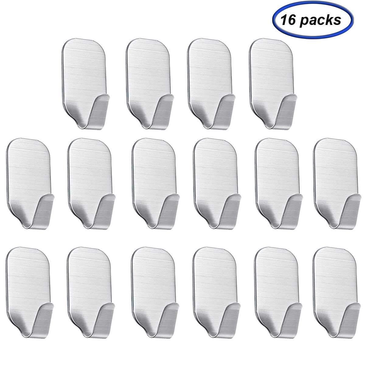 Adhesive Hooks, Sfemn Heavy Duty Wall Hooks Stainless Steel Waterproof Wall Hangers for Robe, Coat, Towel, Keys, Bags, Home, Kitchen, Bathroom - 16-Pack