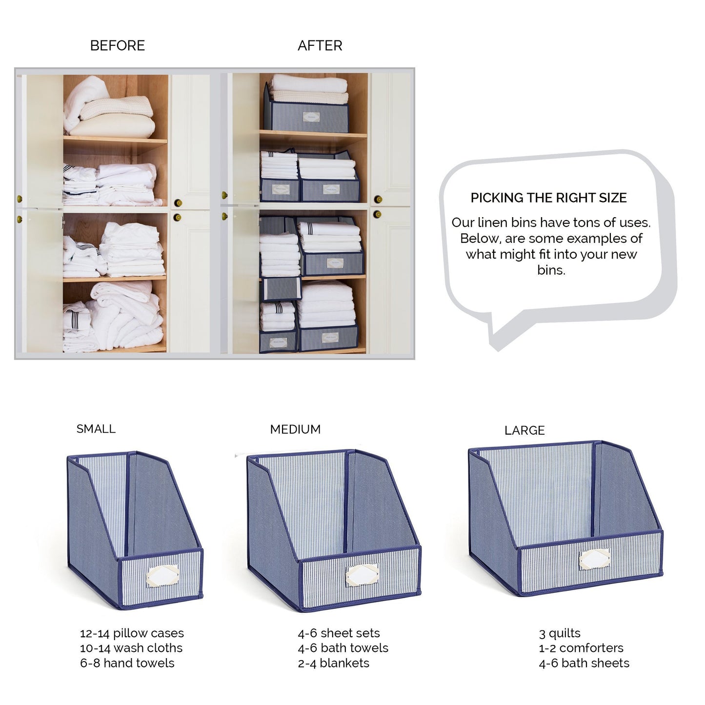 Details: Sheets should tumble in the dryer, not out of the closet. Afraid to open the linen closet door for fear of a towel avalanche? You won't be with our Collapsible Linen Storage. Available in three sizes (small, medium and large), our all cotton linen closet bins are guaranteed to help organize and beautify your closet space, no matter where it is. Measurements and Suggested Uses: Small Linen Storage ( 8.25" W x 15" D x 12.5" H) Suggested Use: 12-14 Pillow Cases, 10-14 Face Towels, 6-8 Hand Towels Medium Linen Storage (13" W x 15" D x 12.5" H) Suggested Use: 4-6 Sheet Sets, 4-6 Bath Towels, 2-4 Blanket Large Linen Storage (17" W x 15" D x 12.5" H) Suggested Use: 3 Quilts, 1-2 Comforters, 4-6 Bath Sheets