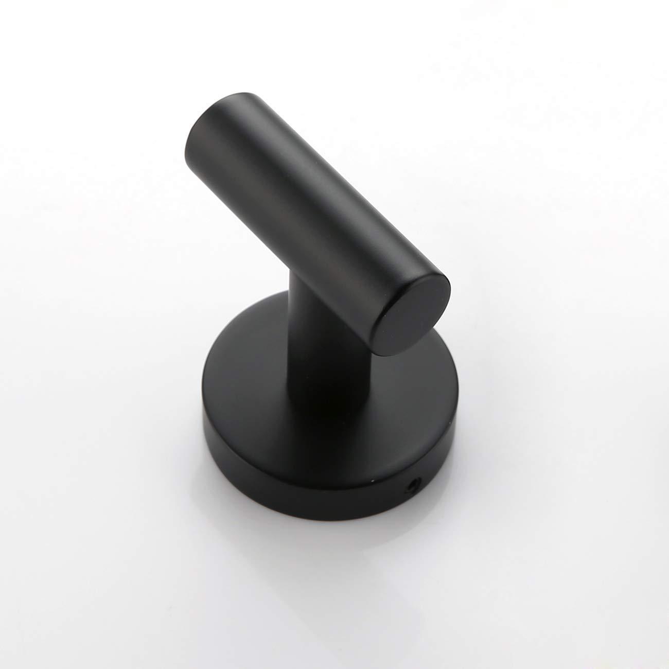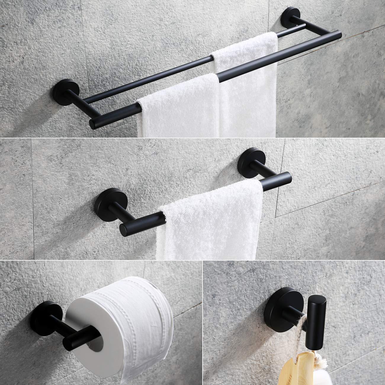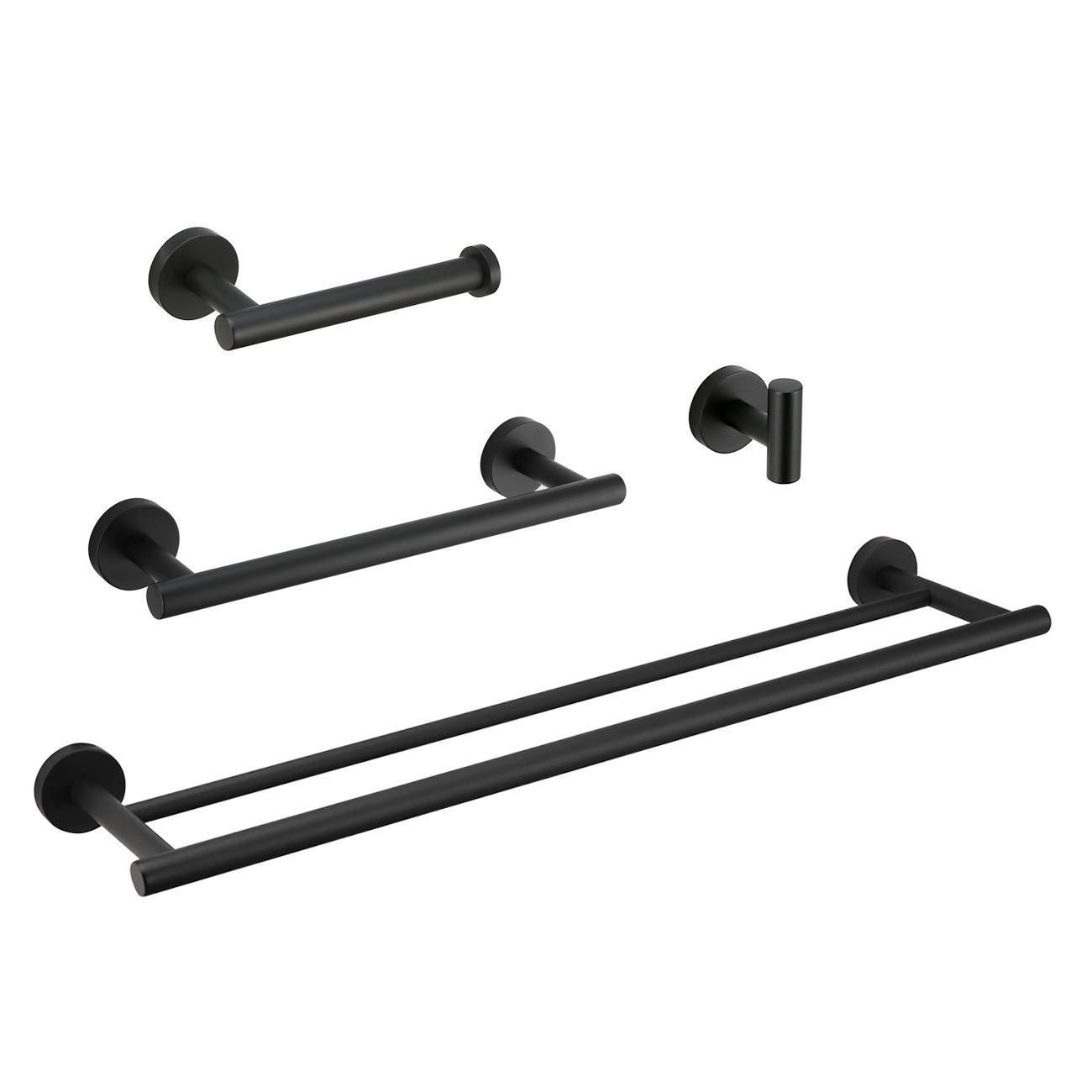 Hoooh Matte Black 4-Piece Bathroom Accessories Set Stainless Steel Wall Mount - Includes Double Towel Bar, Hand Towel Rack, Toilet Paper Holder, Robe Hooks, BS100S4-BK