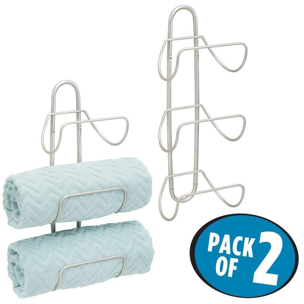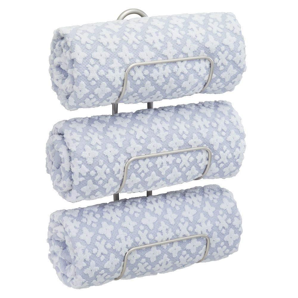 Details: The mDesign Decorative Three Tier Wall Mount Towel Holder will ensure that towels are always at your fingertips in the bathroom or anywhere in the home. The stylish curves of this holder add a modern look to any bathroom motif, while its open design keeps towels at the ready for you or your guests. Towels of all sizes easily fit into the holder, just roll them to fit. The holder easily installs with the included hardware.
