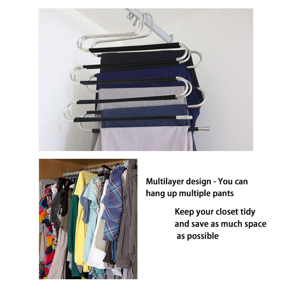 5 Layers - Hang 5 pairs of pants at the same time. Scarf hangers space saving and takes up way less space in the closet.