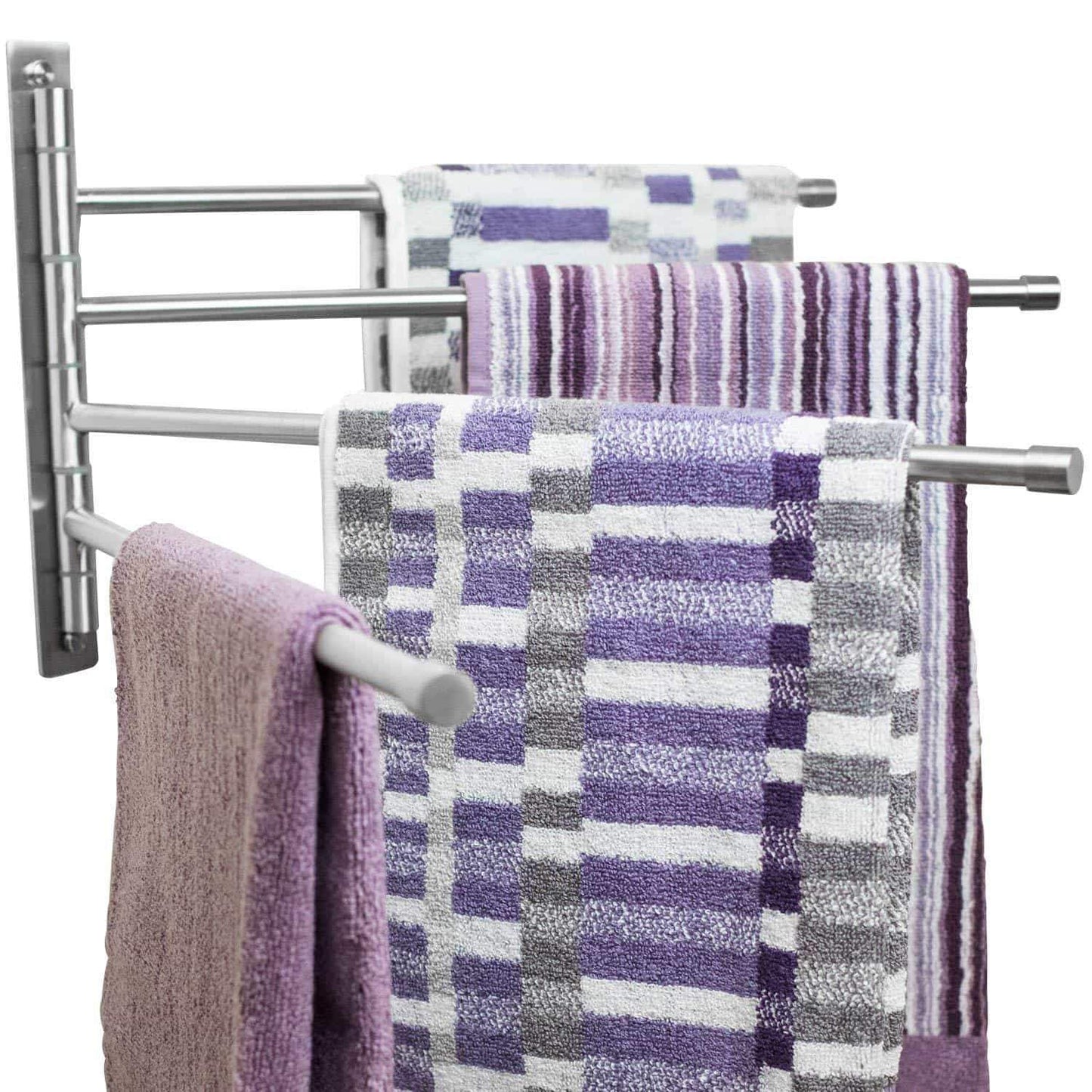 - AMAZING DESIGN- GREATER SIZE: While most similar products are around 13" long, this stainless steel towel bar is 17" long and 10" tall, ensuring that it can store even your biggest towels! This amazing towel rack features 4 swing arms that can rotate 360°, allowing you to hang your wet and dry towels simultaneously, without them touching one another!